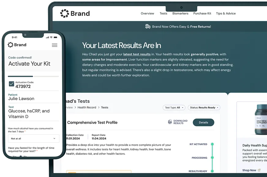 Choose from 200+ biomarkers, white-label the test kits and platform, and deploy your testing experience.