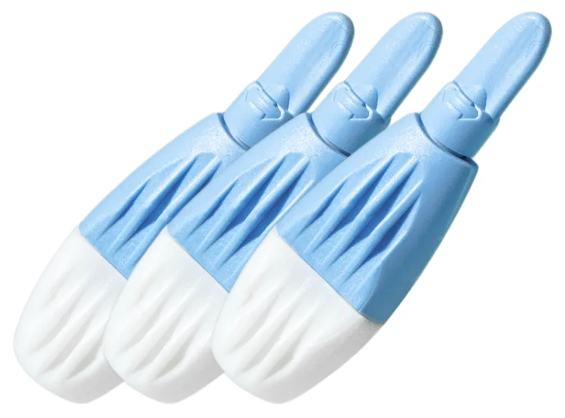 Without touching the strips on the collection device card, lay it on the table in front of you. Wipe your least calloused finger (usually your ring finger) with a provided alcohol wipe. Grasp the narrow end of a lancet. Twist and pull off the cap.