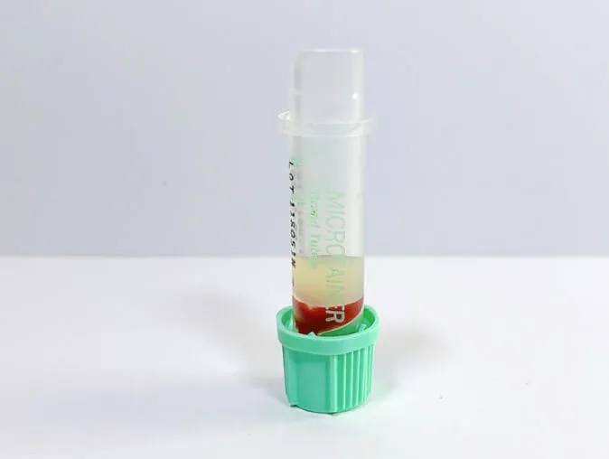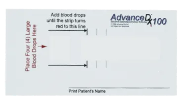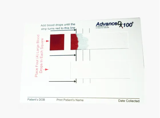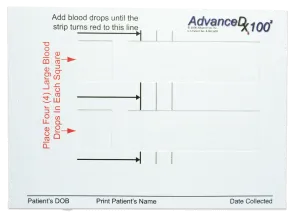 A video of this process is included below. Apply the lancet to either side of your finger. Press the lancet into your finger until you hear a click. Massage (don’t squeeze) your finger as needed to increase blood flow. Add blood to the square indicated on the collection device. Fill the device to the first red line indicated on the card.