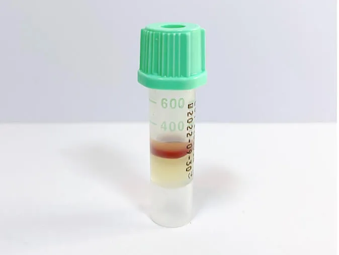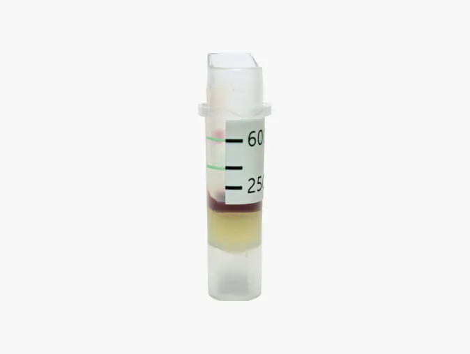 Add blood to the square indicated on the collection device. Fill the collection device to the first line indicated on the strip.