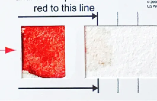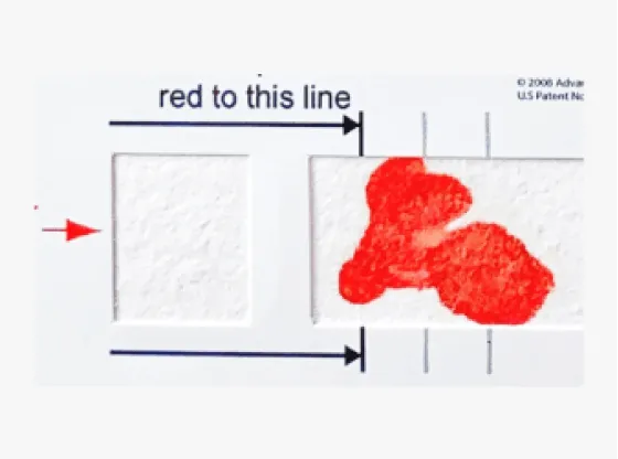 Add 3-5 ladybug-sized blood drops to each square indicated on the collection device, until each strip turns red to the indicated line. Having difficulty getting blood?