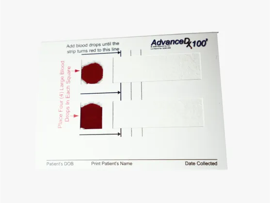 A video of this process is included below. Apply the lancet to either side of your finger. Press the lancet into your finger until you hear a click. Massage (don’t squeeze) your finger to increase blood flow. Add blood to each square indicated on the collection device. Fill the device to each first red line indicated on the card.