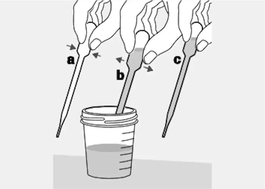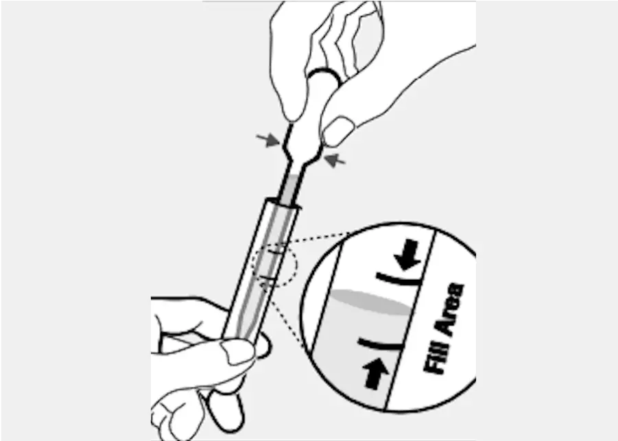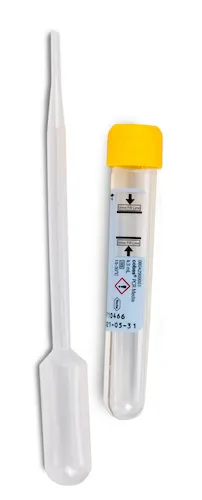 Use the disposable pipette to transfer urine from the collection cup to the transport tube (without piercing the foil in the tube). The fill line - 2ml - is indicated by an arrow on the tube. Try not to overfill the tube.